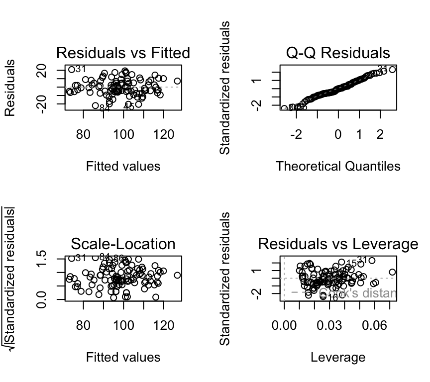 # Check the assumptionspar(mfrow=c(2,2))plot(m1, which =c(1,2,3,5), add.smooth =FALSE)