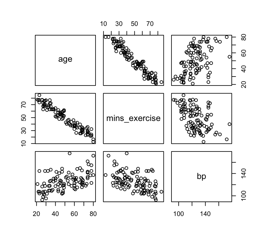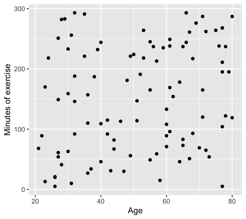 And here we see no relationship between age and minutes of exercise. The two explanatory variables appear to be independent.