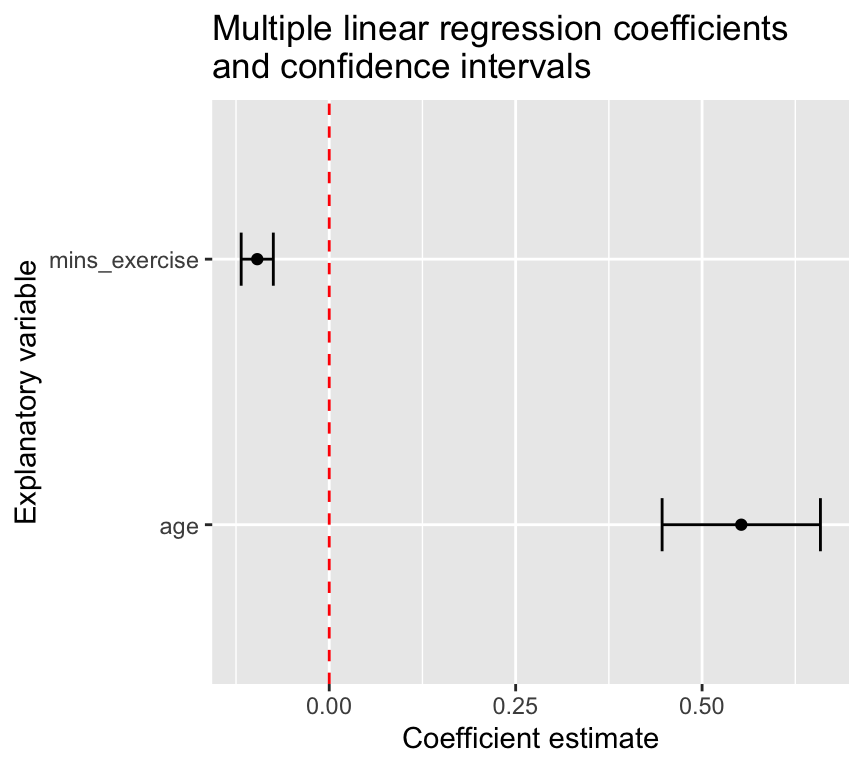 As well as or rather than a table of coefficients, we could make a figure showing the coefficients and confidence intervals for each explanatory variable. This can be a nice way to visualise the results of the multiple linear regression model.