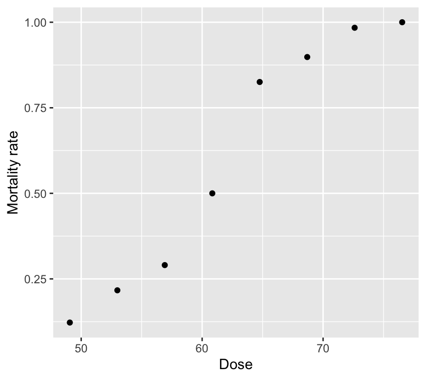 The plot is intentionally made to show what happens at very low and very high dose. At very low dose, the predicted mortality probability approaches 0, and at very high dose it approaches 1. This is a key feature of binomial regression: the predicted probabilities are always between 0 and 1. No matter the value of the linear predictor, the inverse logit transformation always maps it to a probability between 0 and 1.