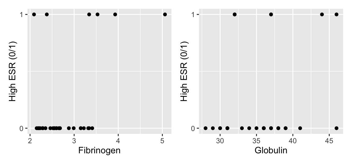 The ESR response variable is in two variables. ESR is a factor with levels “low” and “high”. It is also present as a numeric variable y, coded 0 (low) and 1 (high). The explanatory variables are fibrinogen and globulin, both continuous.