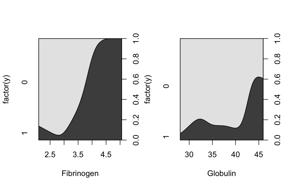 par(mfrow = c(1, 1))It looks like higher fibrinogen and higher globulin are associated with higher probability of high ESR. The pattern appears stronger for fibrinogen.