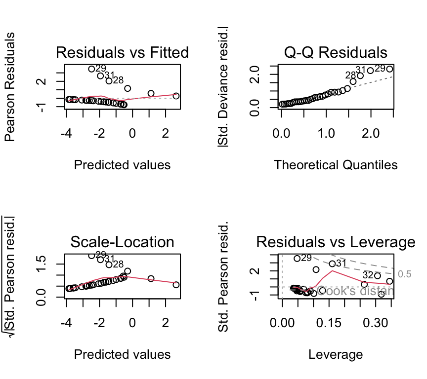 plasma_glm <- glm(y ~ fibrinogen + globulin, data = plasma, family = binomial)Complication 2: model checking and dispersion